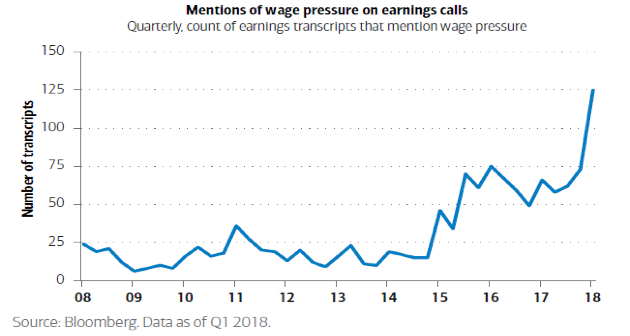 1. El mercado laboral de los Estados Unidos está en su punto más bajo en 17 años, con una tasa de desempleo del 3,9%. Las compañías estadounidenses están luchando para llenar puestos de trabajo; se estima que actualmente hay cerca de 6 millones de ofertas de empleo, desde “recolectores de manzanas hasta genios de Apple”. Si bien el crecimiento de los salarios sigue siendo lento, parece ser una creciente preocupación que podría pesar sobre los márgenes de las empresas en los próximos trimestres.