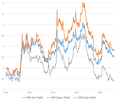 While fundamentals appear benign at this point, valuations have become less compelling. As the charts below show, emerging market bond yields are back to all-time lows. Looking within the different segments, this is particularly true of emerging market corporate issuers, rather than sovereign or quasi sovereign credits.